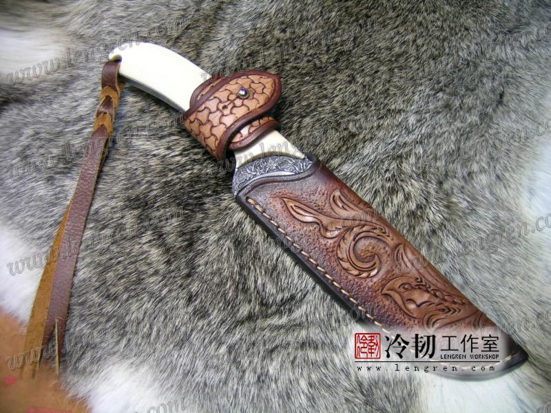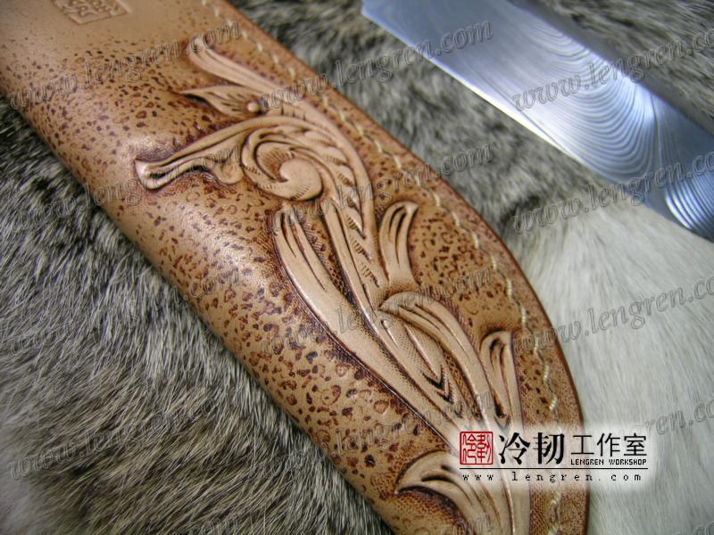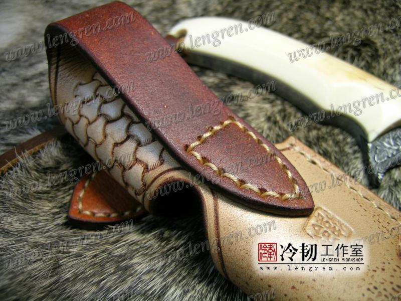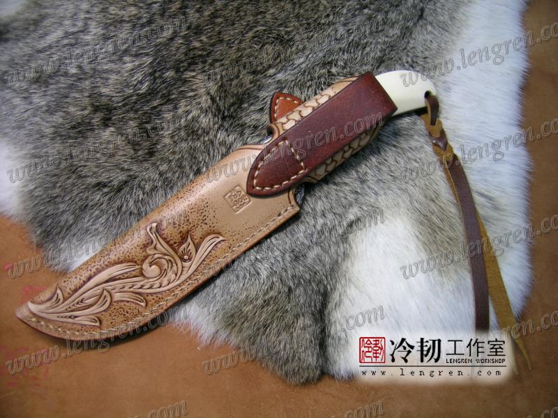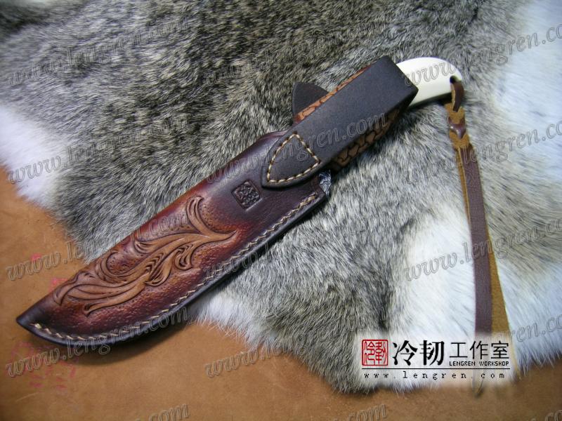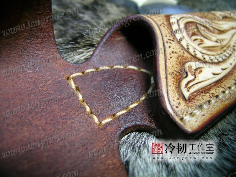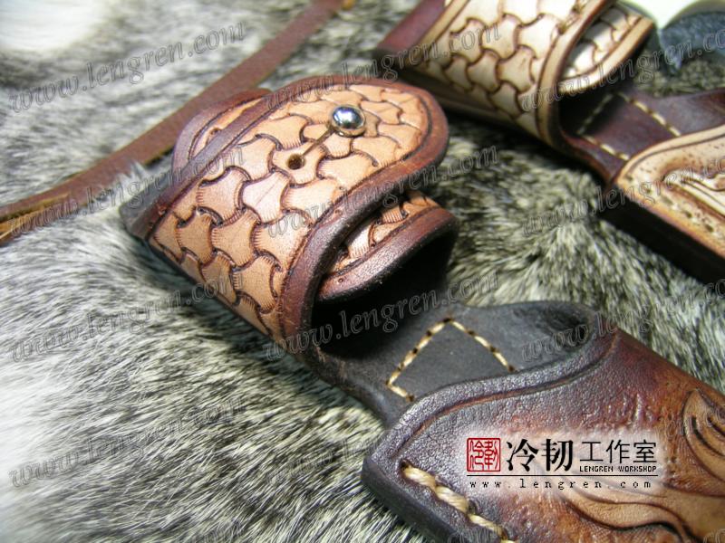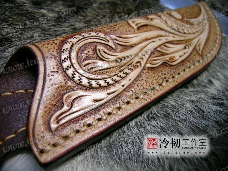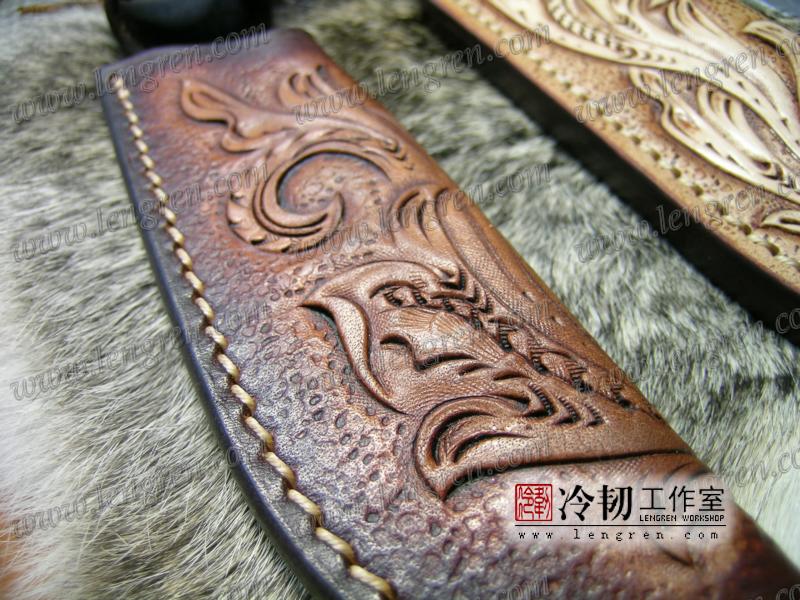 手工染色,手工雕刻。3.5mm硬质头层牛皮缝制。 刀柄处按扣设计,方便快开。 刀鞘背面有腰带环可佩带在要带上。 刀鞘前端三层缝制,刀刃不会划伤内部缝线。结实耐用。