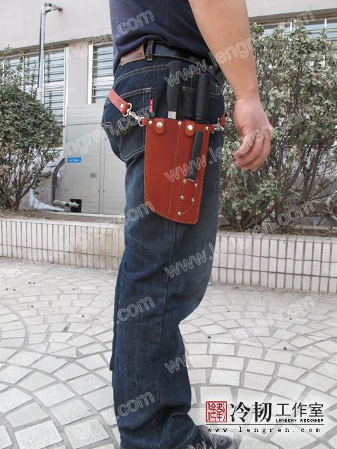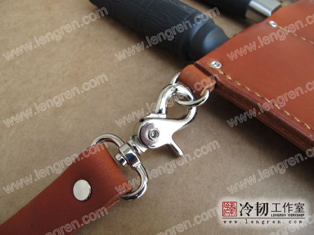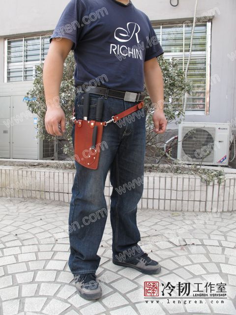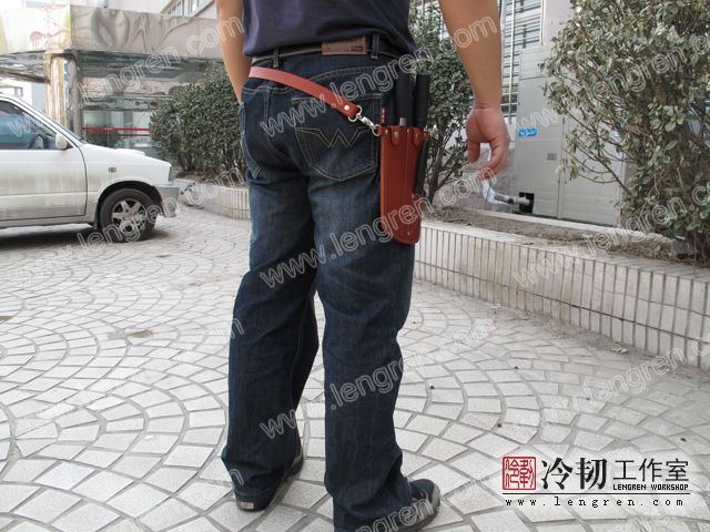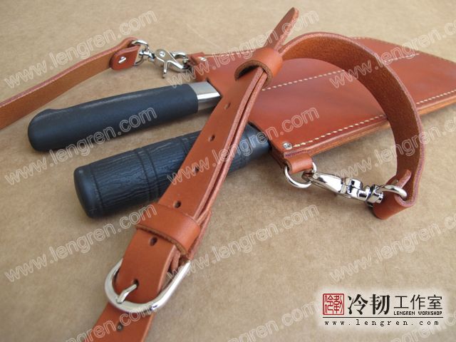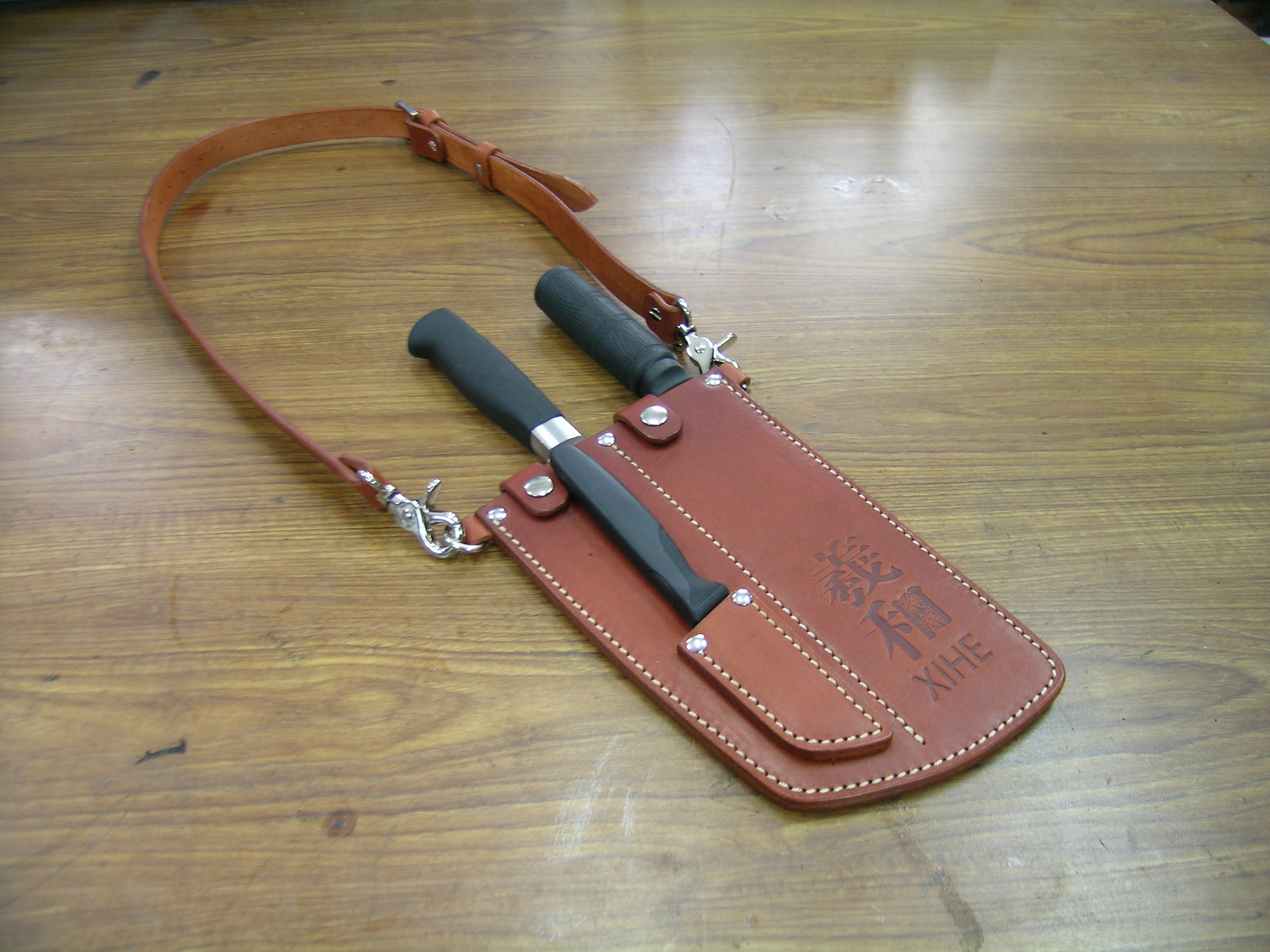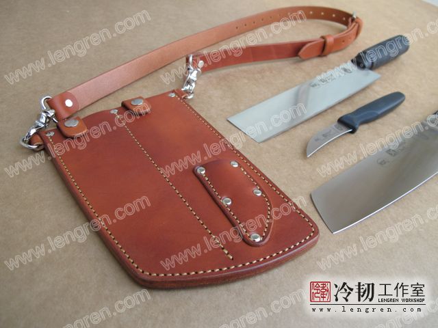4mm头层牛皮缝制。配可调整皮带,可挂在腰间。三件组合刀具使用。专门为烤鸭店定制。纯植鞣革,安全环保。