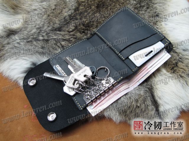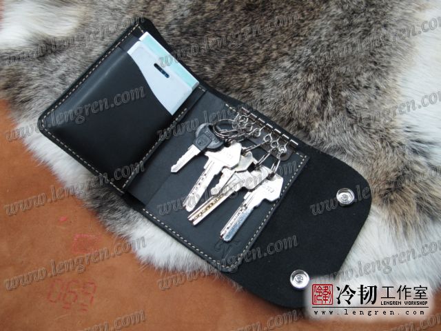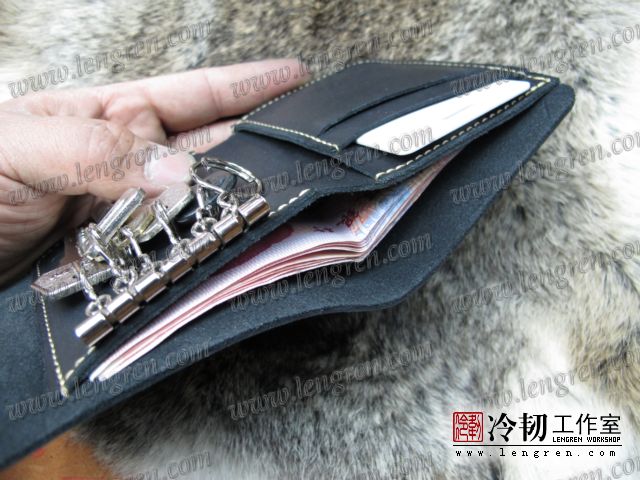 头层牛皮缝制,可放四张卡,现金2000左右。六排扣钥匙挂钩。