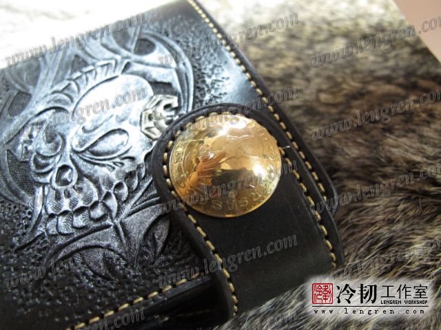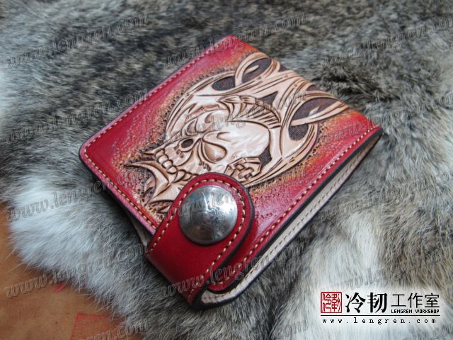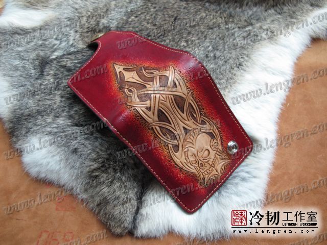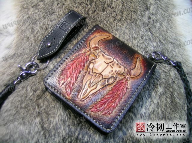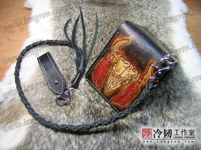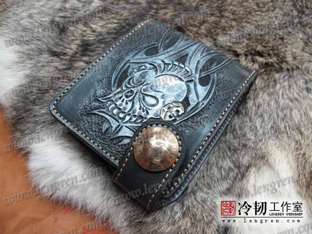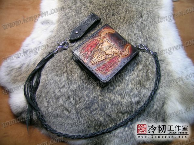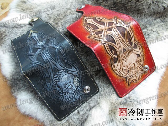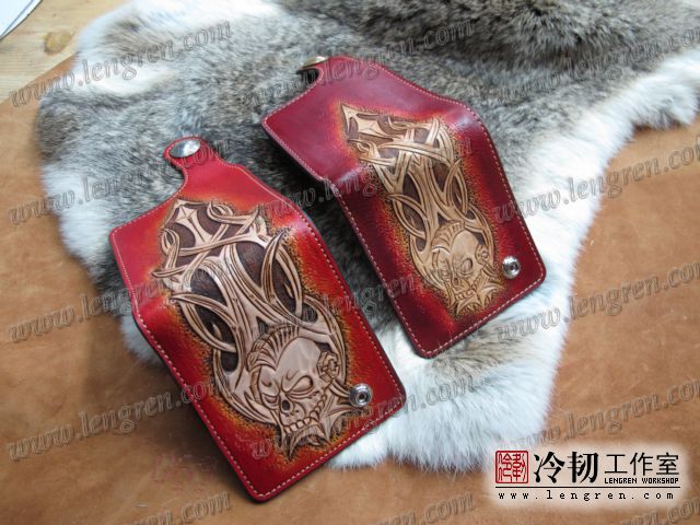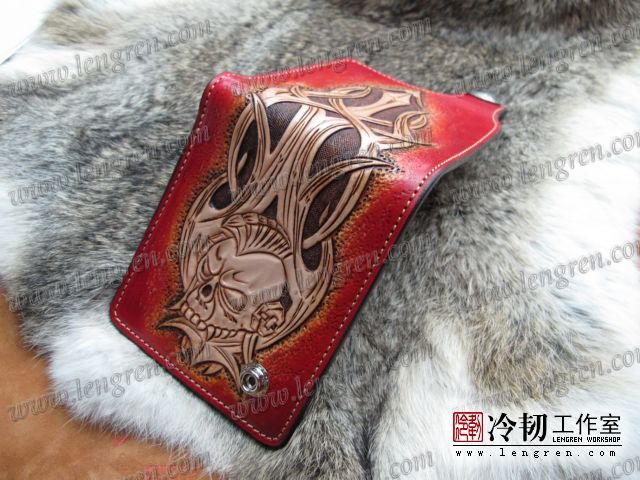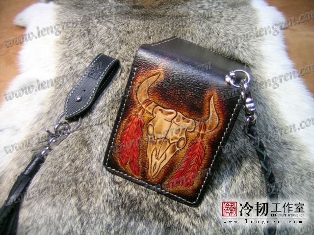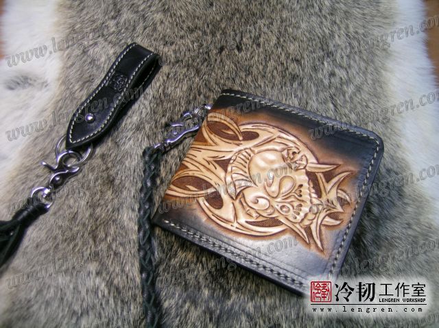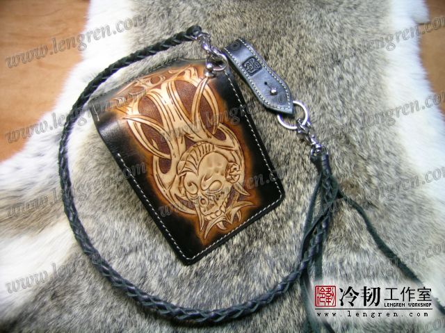 手工雕刻骷髅花纹,内部头层牛皮缝制。4卡位,零钱袋,可放两千块左右,适合放在衣兜,裤兜里。配编织牛皮链子。