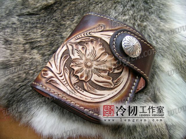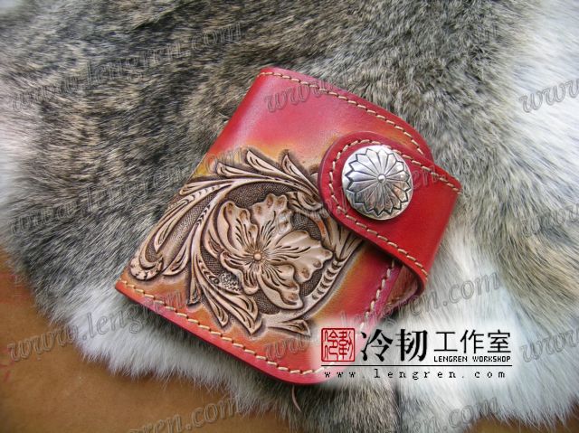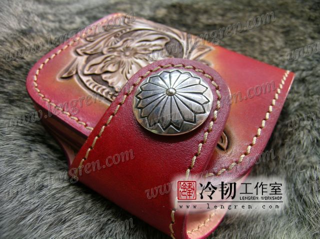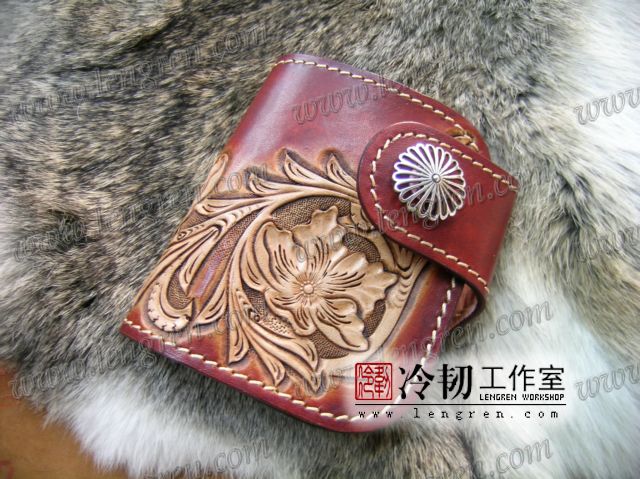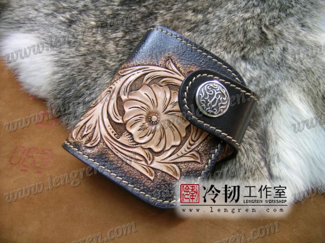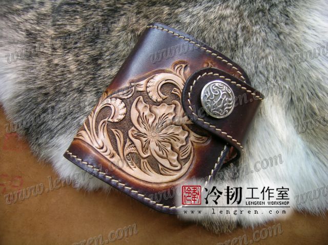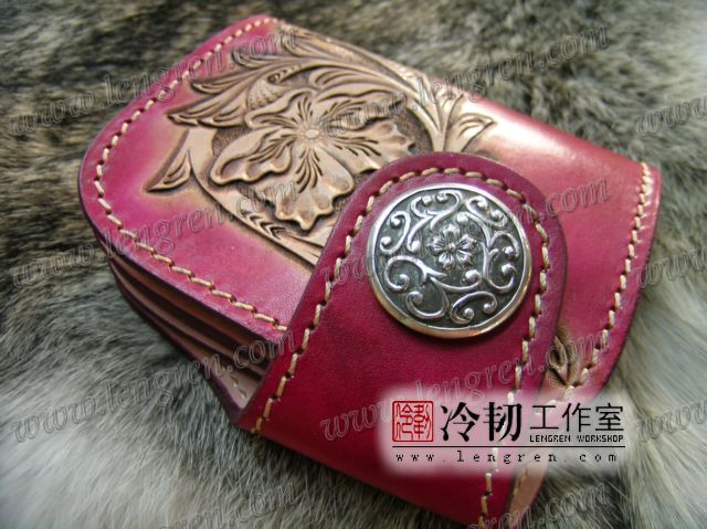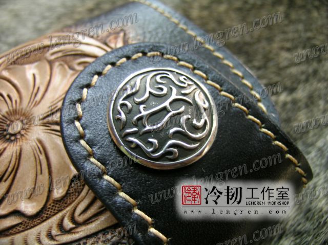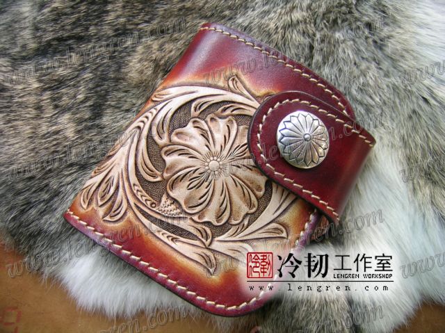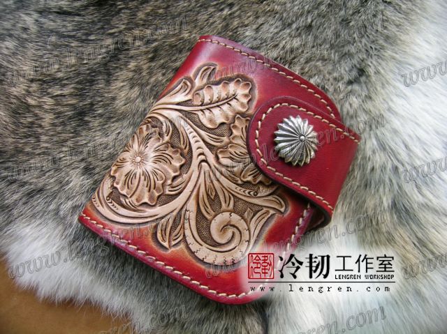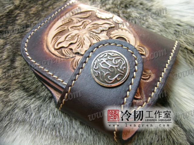 头层牛皮缝制,4卡位,拉锁零钱袋。可放两千块左右,适合放在衣兜,裤兜里。方便携带。硬币装饰扣。925银装饰扣。手工雕刻唐草花纹,彩色。