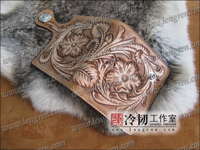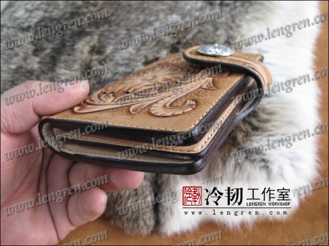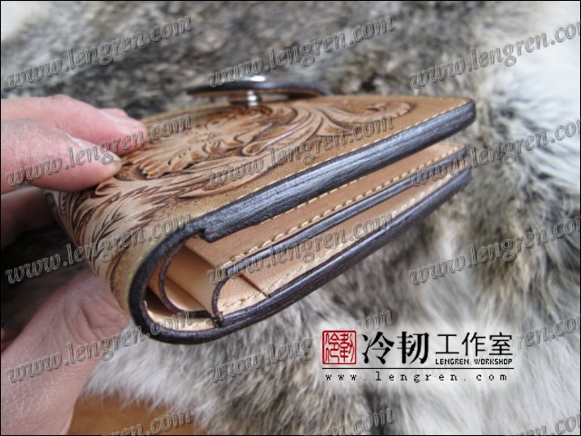 头层牛皮缝制,10卡位,1照片位。可放四千块左右,适合放在衣兜,裤兜里。方便携带。925银装饰扣。手工雕刻唐草花纹,彩色。