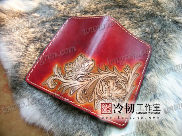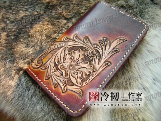 中长款钱包,头层牛皮缝制,5卡位,拉锁包,方便放在衣服兜里。可放三千左右现金。手工雕刻唐草花纹,彩色。