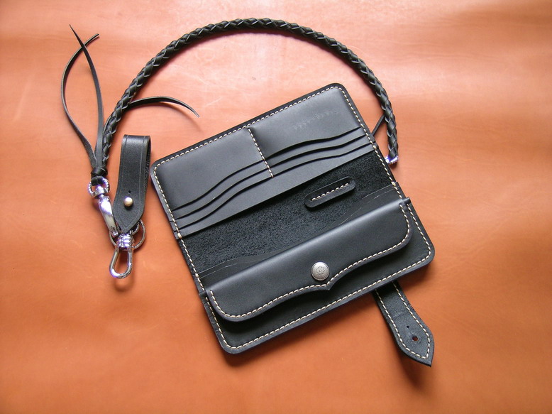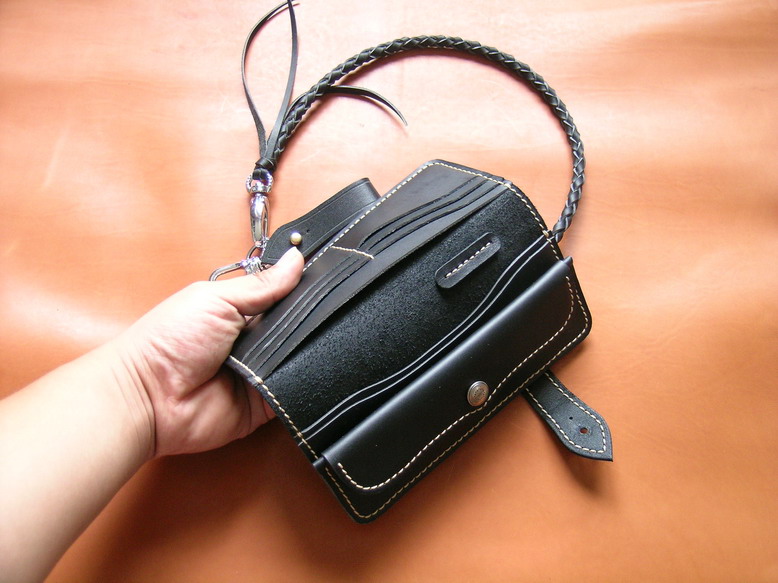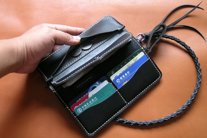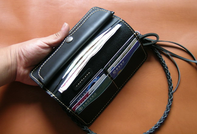 头层牛皮缝制,6卡位,零钱袋,可放6000元左右现金。配编织皮链。
