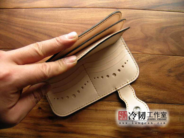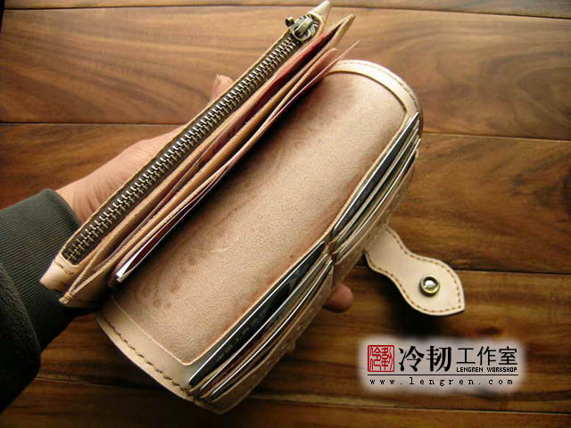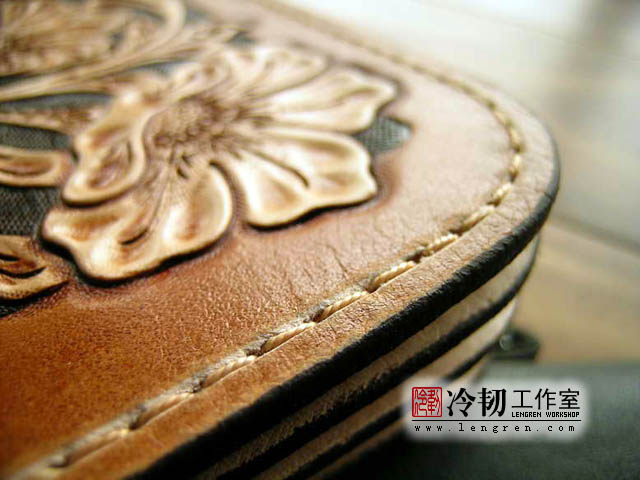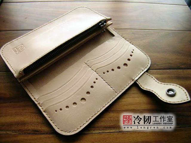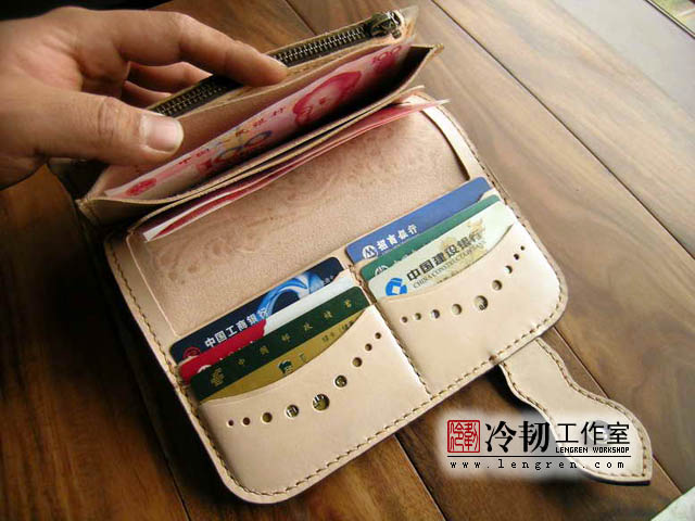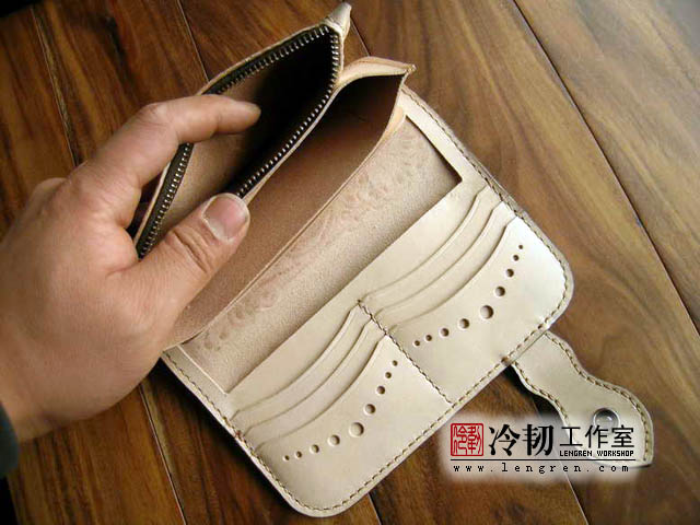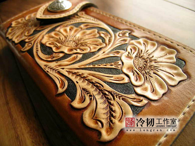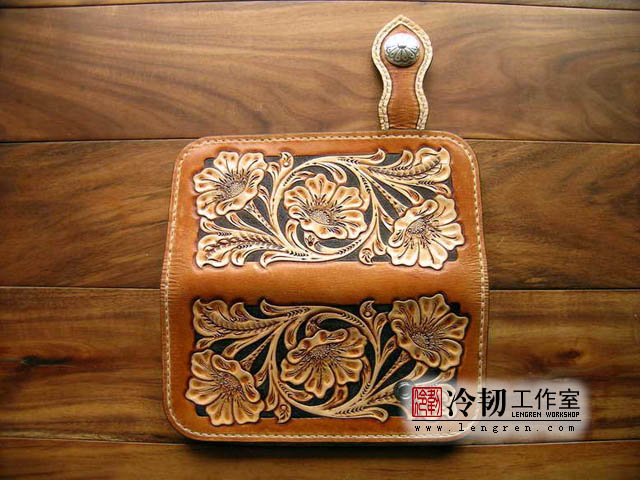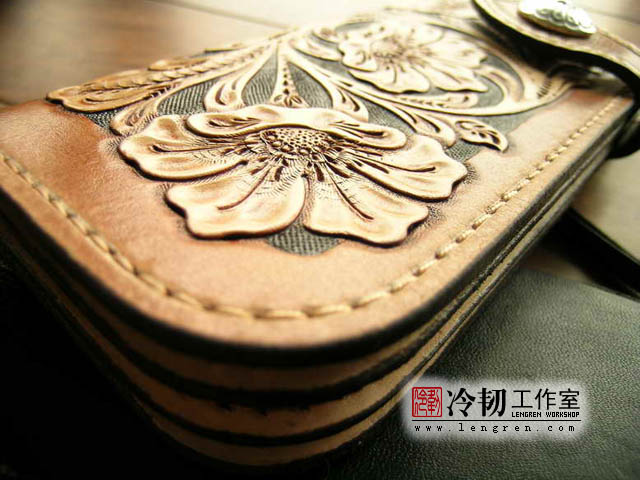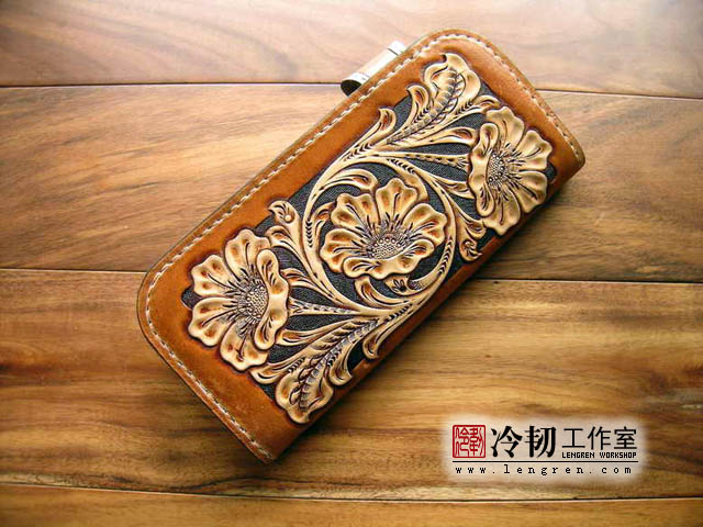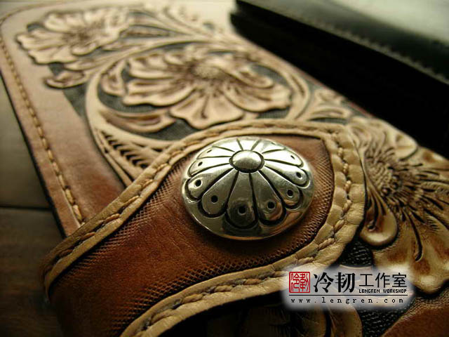 头层牛皮缝制,手工雕刻染色,6卡位,拉锁零钱包。925银装饰扣。