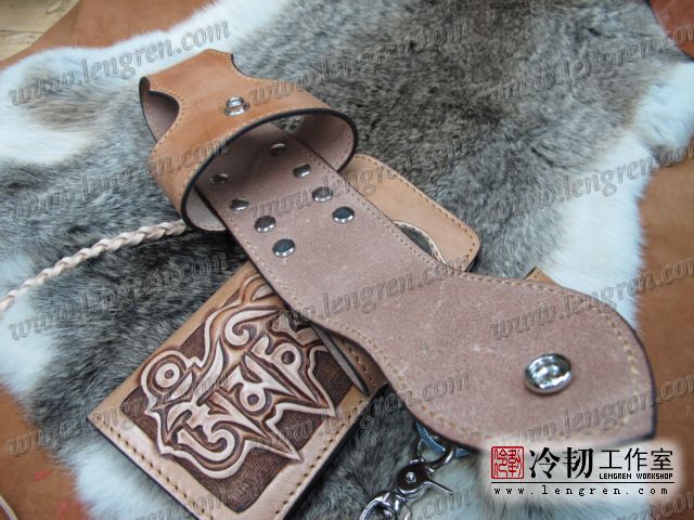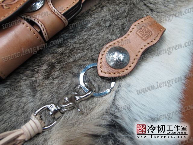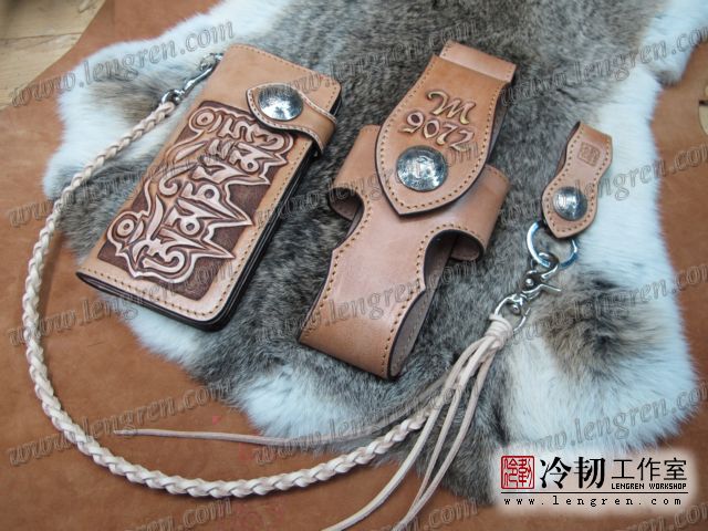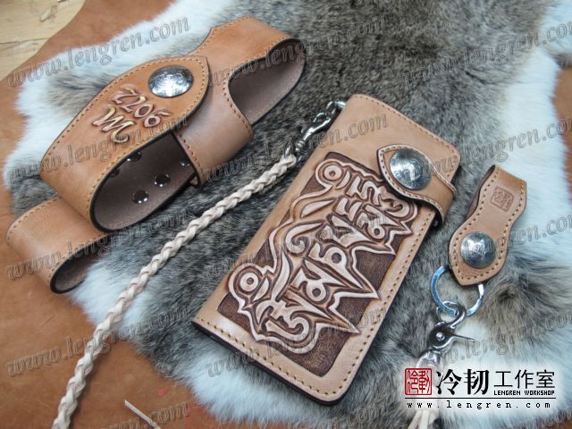头层牛皮缝制,手工雕刻染色,六字箴言纹。10卡位,拉锁零钱包。925银装饰扣,硬币扣可选。牛皮外挂,编织皮链,纯铜金属挂钩。机车骑士绝配。