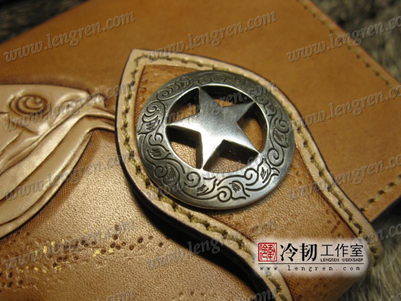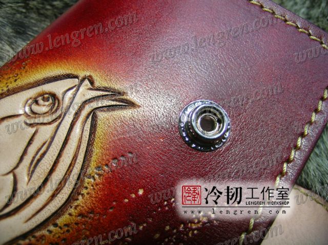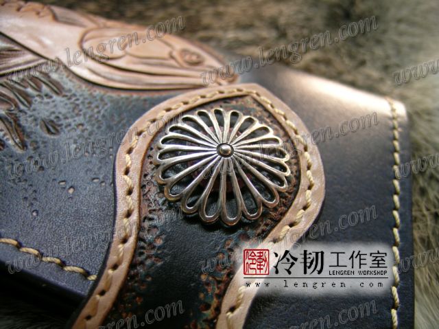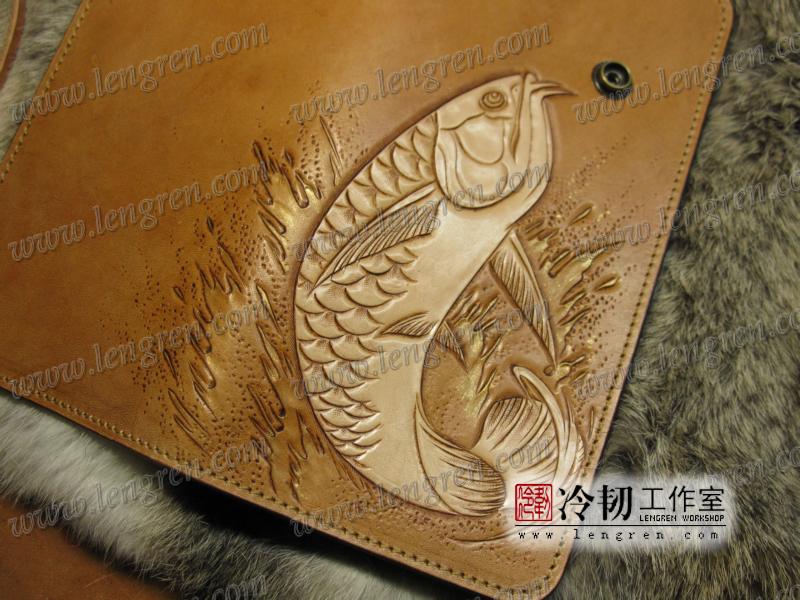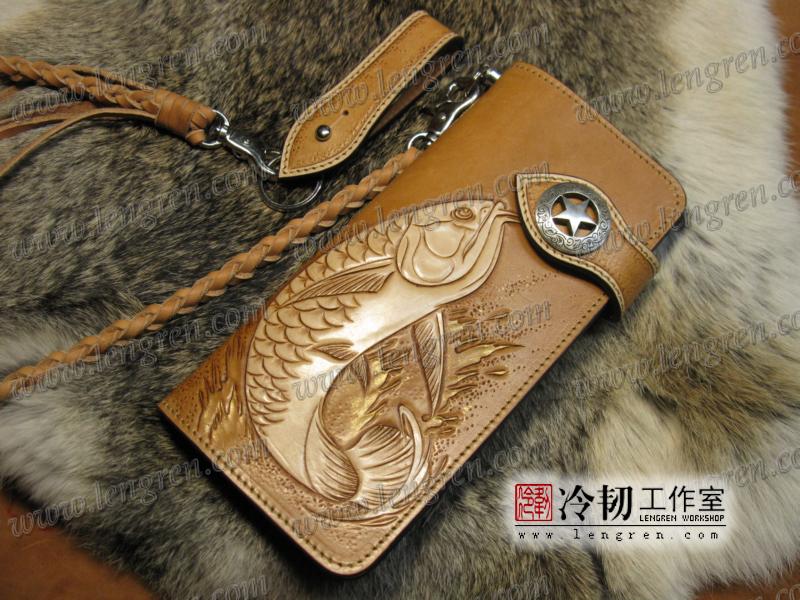头层牛皮缝制,手工雕刻染色,龙鱼纹。10卡位,拉锁零钱包。925银装饰扣,硬币扣可选。牛皮外挂,编织皮链,纯铜金属挂钩。