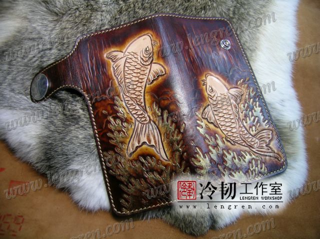头层牛皮缝制,手工雕刻染色,鲤鱼纹。10卡位,拉锁零钱包。925银装饰扣,硬币扣可选。