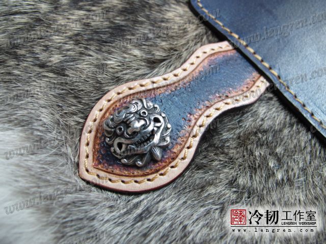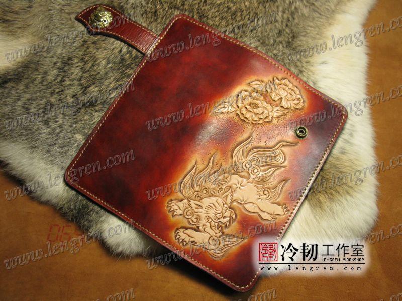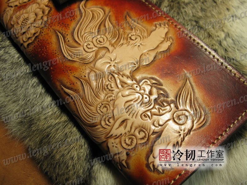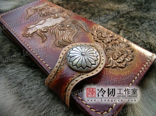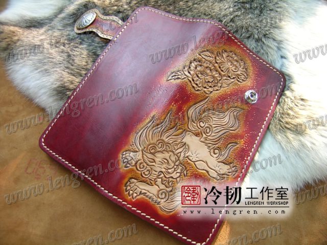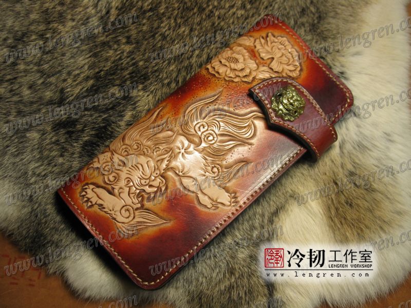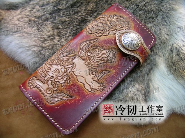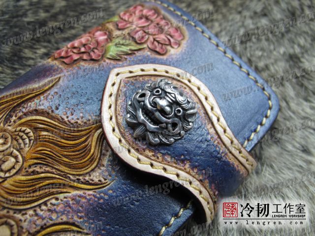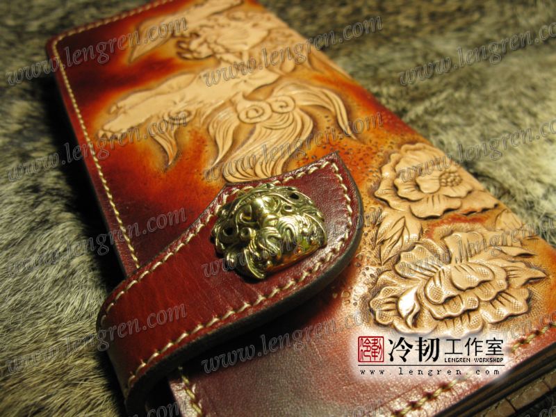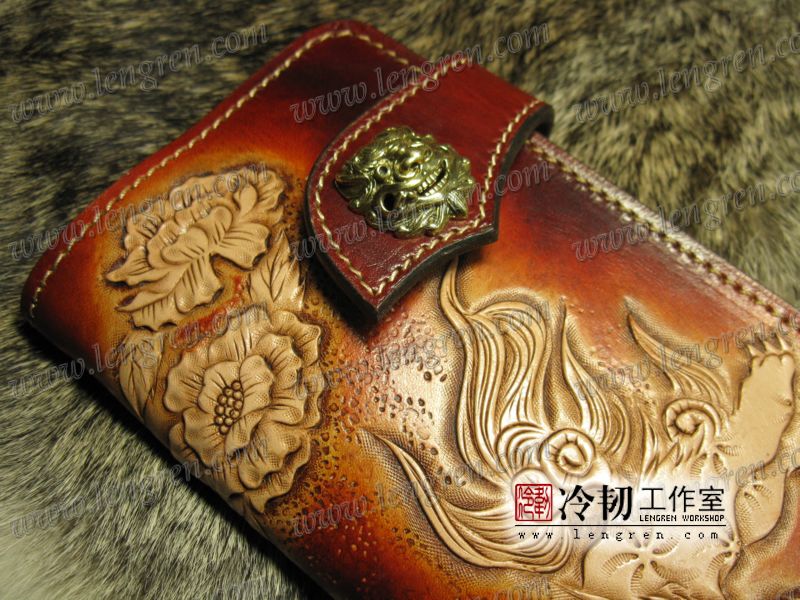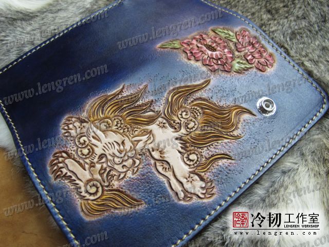 头层牛皮缝制,手工雕刻染色,牡丹狮子纹。10卡位,拉锁零钱包。925银装饰扣,硬币扣可选。