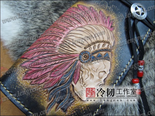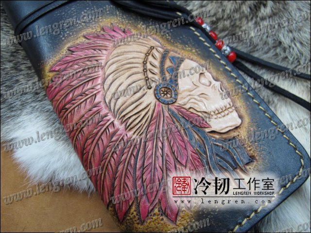 头层牛皮缝制,手工雕刻染色,印第安骷髅纹。10卡位,拉锁零钱包。925银装饰扣,硬币扣可选。