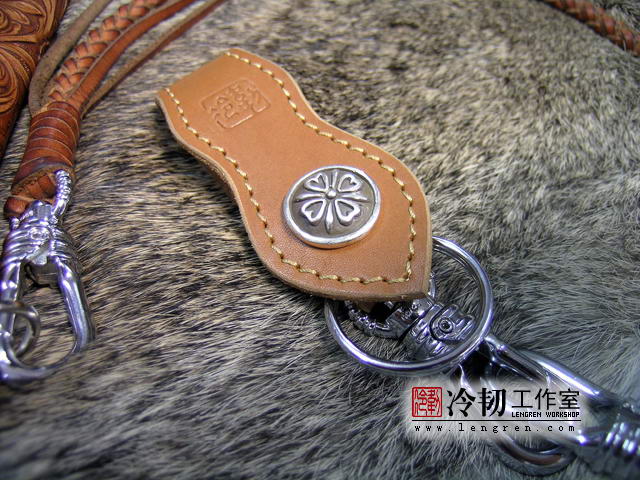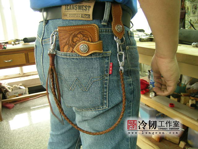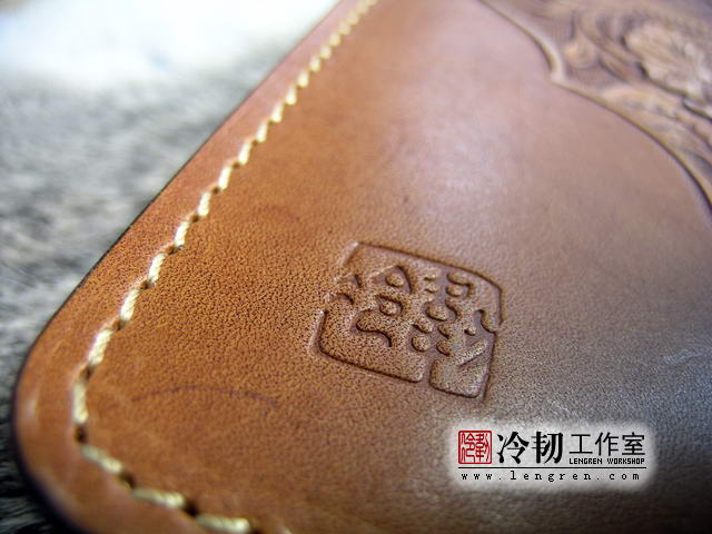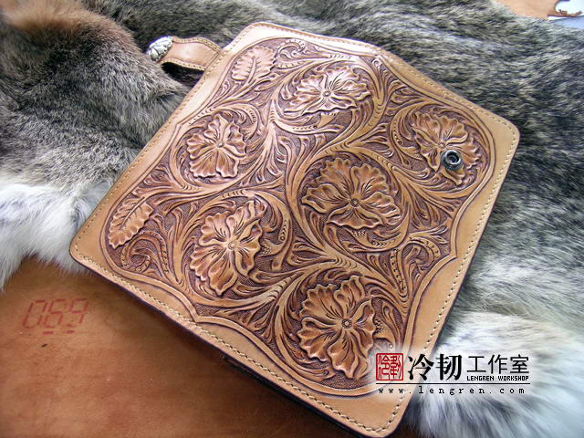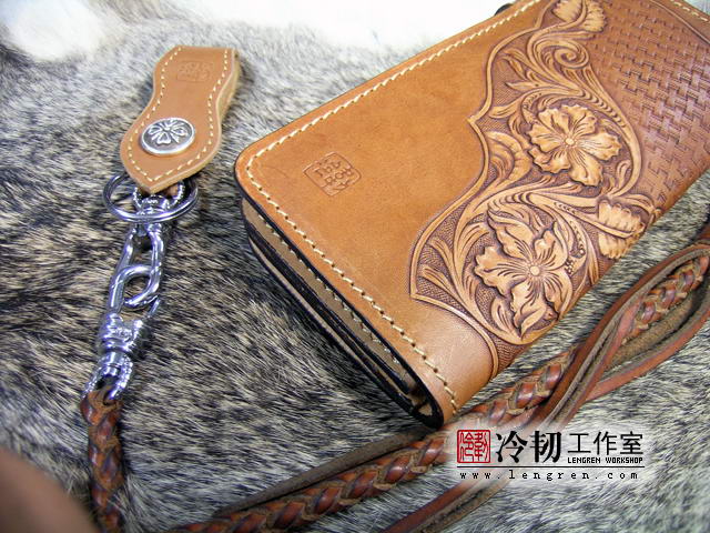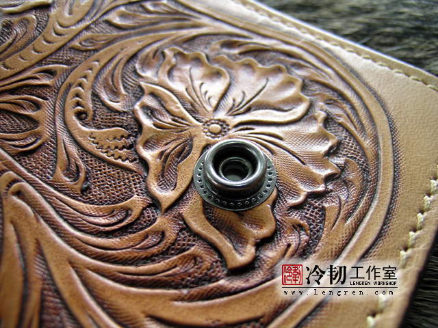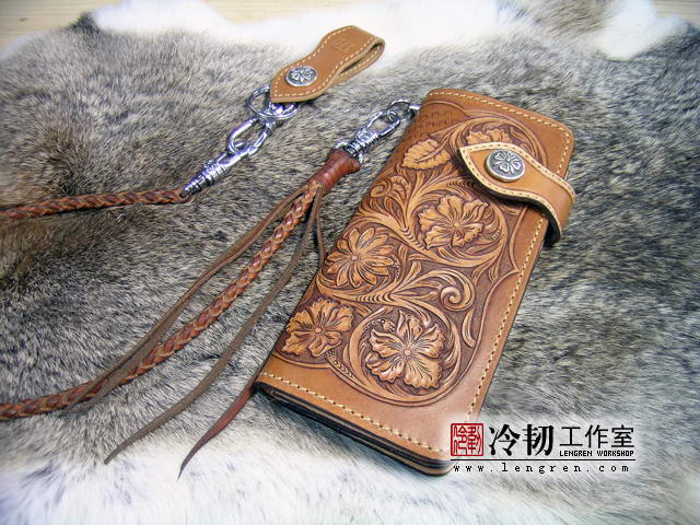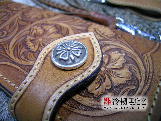 头层牛皮缝制,手工雕刻染色,唐草纹。10卡位,拉锁零钱包。925银装饰扣,硬币扣可选。