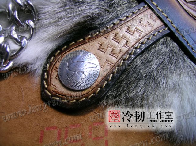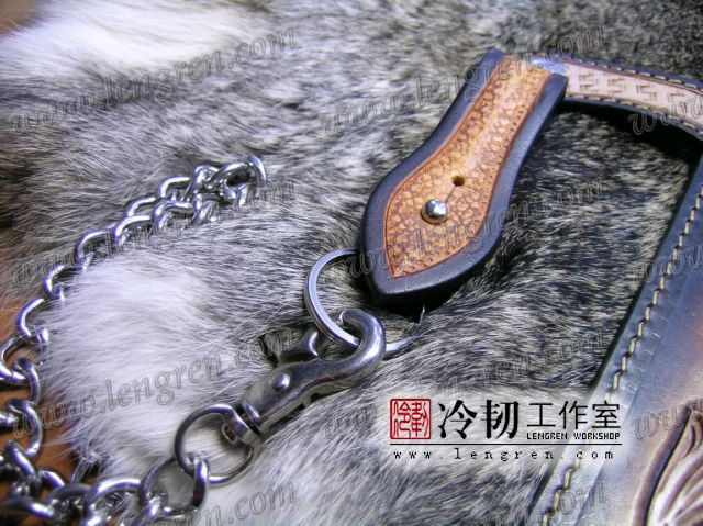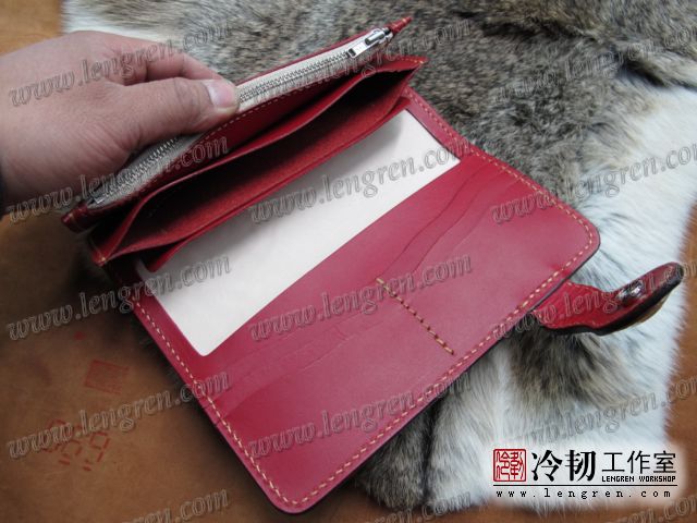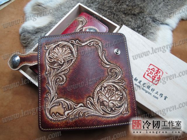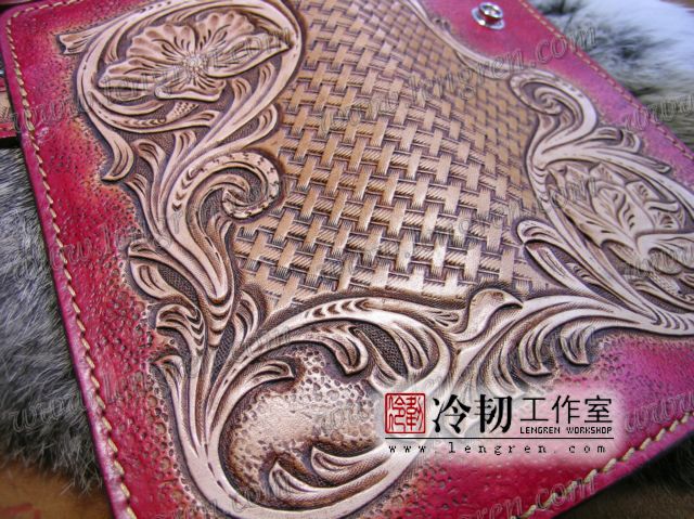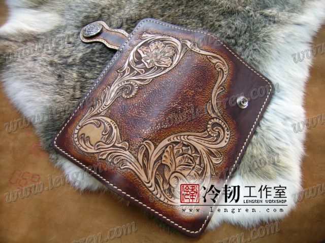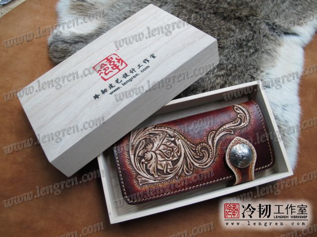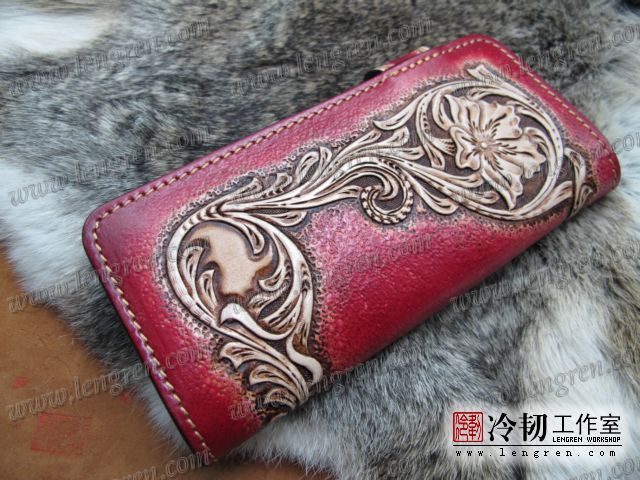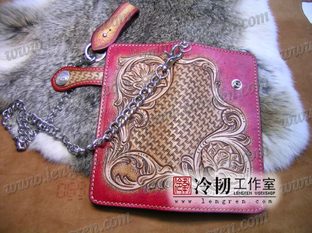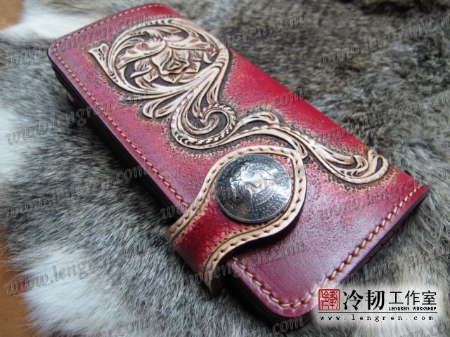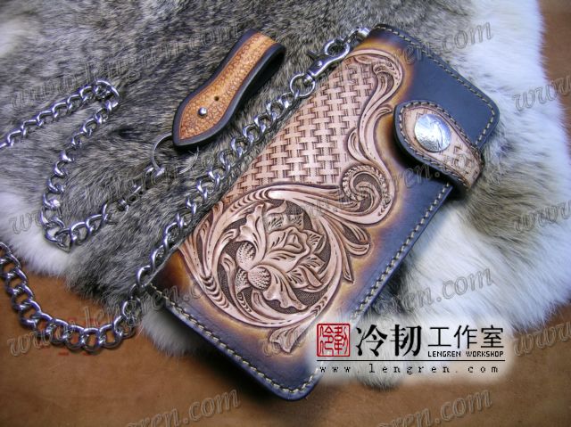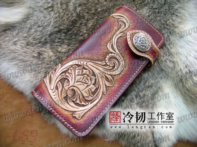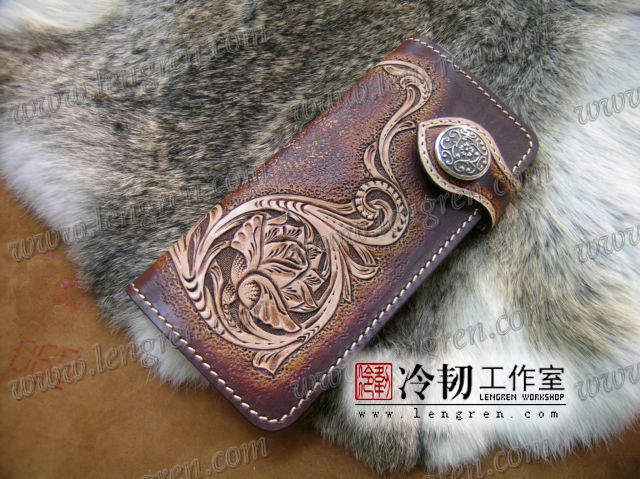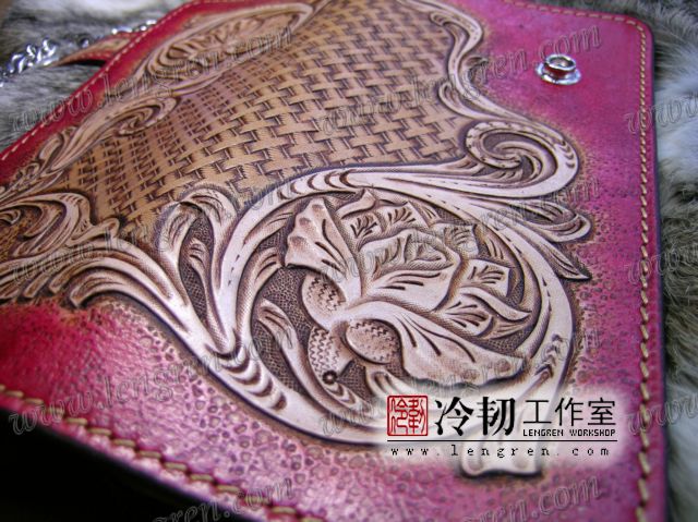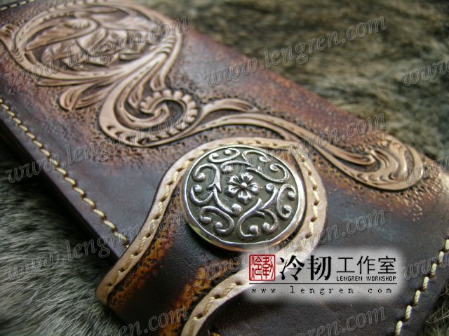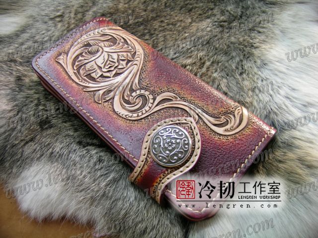 头层牛皮缝制,手工雕刻染色,彩色唐草纹。10卡位,拉锁零钱包。925银装饰扣,硬币扣可选。