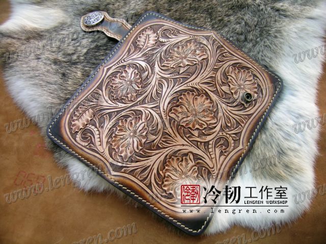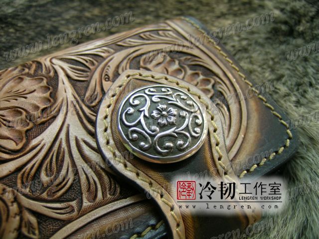 头层牛皮缝制,手工雕刻染色,彩色唐草纹。10卡位,拉锁零钱包。925银装饰扣,硬币扣可选。