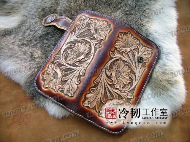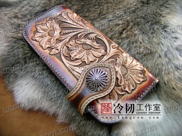 头层牛皮缝制,手工雕刻染色,彩色唐草纹。10卡位,拉锁零钱包。925银装饰扣,硬币扣可选。