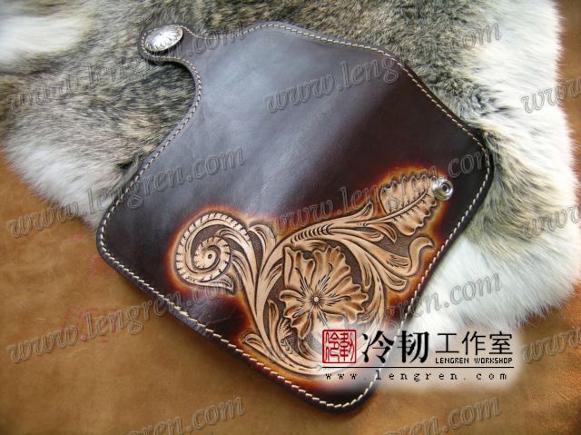 头层牛皮缝制,手工雕刻染色,彩色唐草纹。10卡位,拉锁零钱包。925银装饰扣,硬币扣可选。
