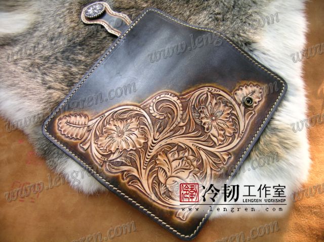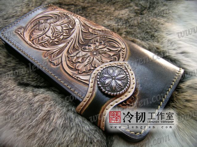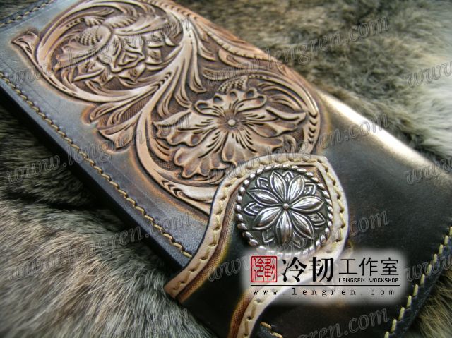 头层牛皮缝制,手工雕刻染色,彩色唐草纹。10卡位,拉锁零钱包。925银装饰扣,硬币扣可选。