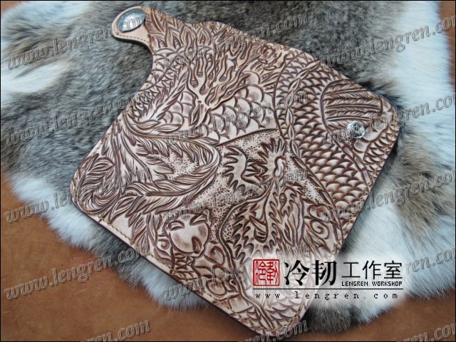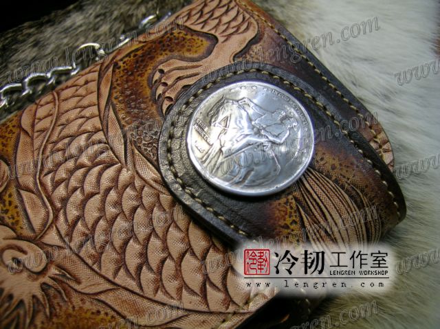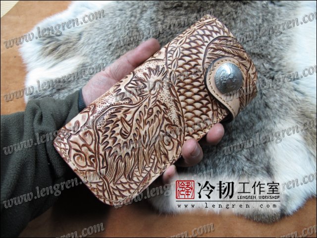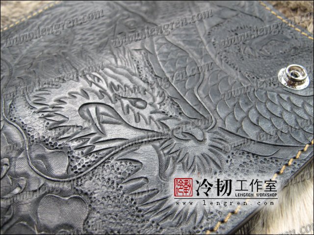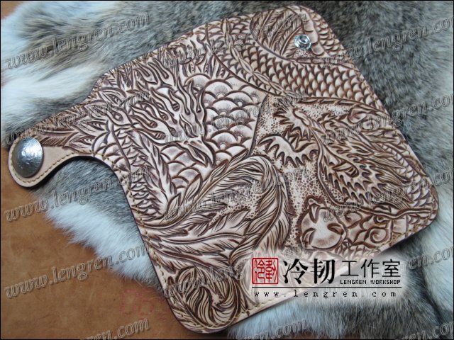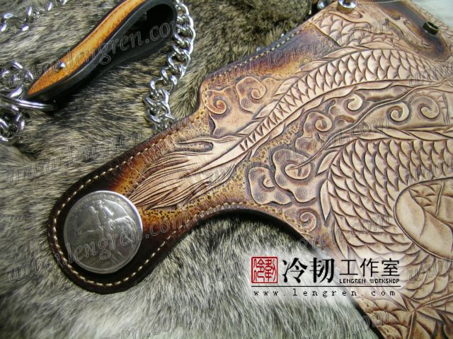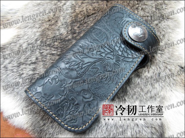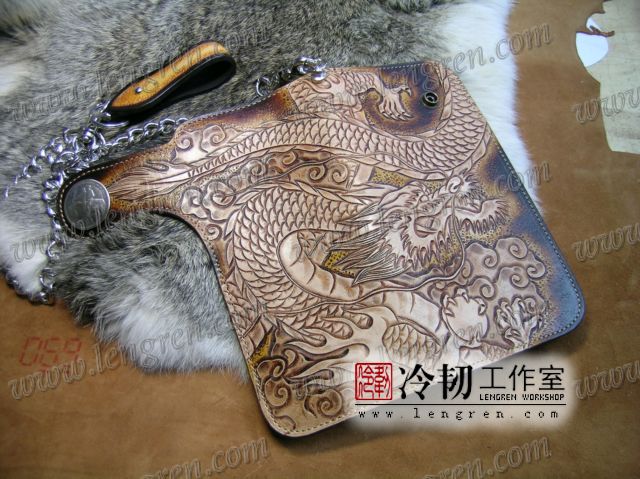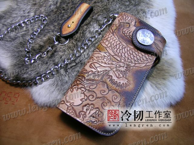 头层牛皮缝制,手工雕刻染色,盘龙纹。10卡位,拉锁零钱包。925银装饰扣,硬币扣可选。可选配牛皮编织皮链,纯铜链,纯铜金属挂钩。