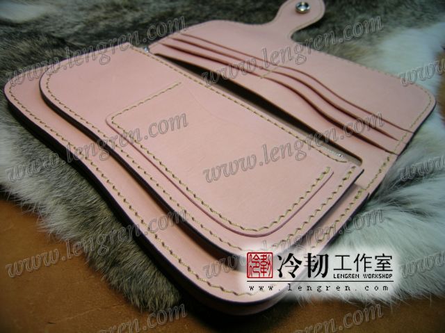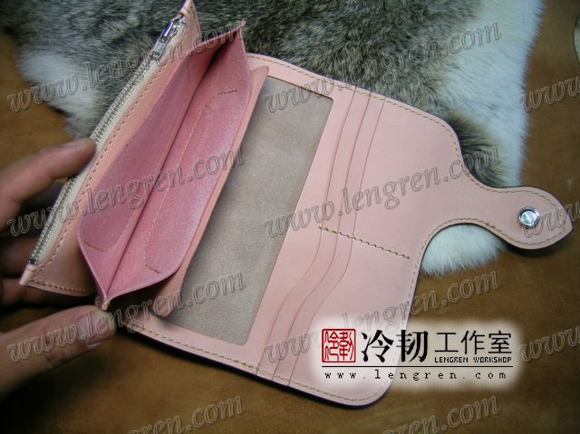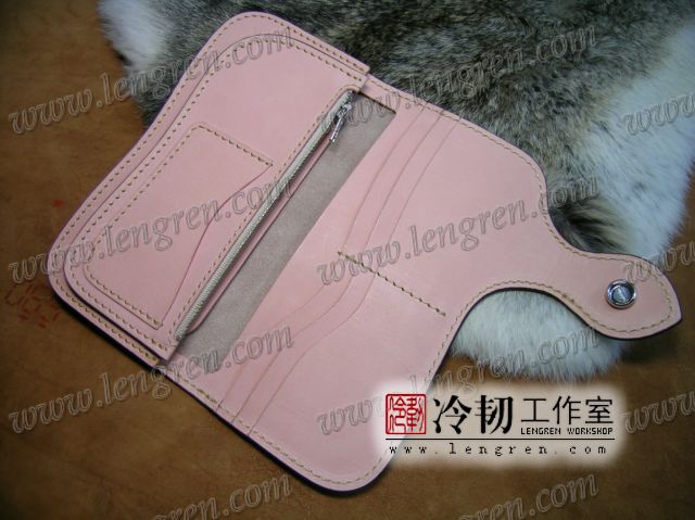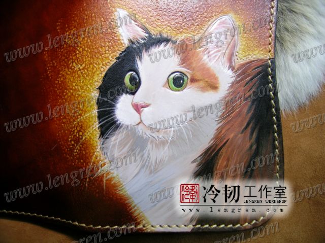 头层牛皮缝制,手工雕刻染色。10卡位,拉锁零钱包。925银装饰扣,硬币扣可选。可选配牛皮编织皮链,纯铜链,纯铜金属挂钩。图案为客户家的猫咪,按照写真照片皮雕+彩绘制作。